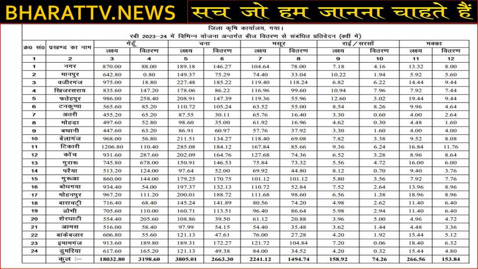 जिला कृषि पदाधिकारी ने बताया कि इस रबी मौसम में विभिन्न योजनाओं के तहत गेहूँ 18042 क्वीं, चना 3805 क्वीं, मसूर 2241 क्वीं, मक्का 266 क्वीं एवं राई/सरसों 158 क्वीं बीज वितरण का लक्ष्य निर्धारित है। राज्य स्तर से प्राप्त लक्ष्य को जिले के सभी प्रखंडों में समानुपातिक रुप से विखंडित कर बीज वितरण का लक्ष्य उपलब्ध कराया गया है। प्राप्त बीज के विरुद्ध जिले में अब तक गेहूँ 3198 क्वीं, चना 2663 क्वीं, मसूर 1494 क्वीं, मक्का 153 क्वीं एवं राई/सरसों 74 क्वीं बीज वितरण किया जा चुका है। बीज प्राप्त करने हेतु इच्छुक किसान बी०आर०बी०एन० के पोर्टल पर किसान पंजीकरण के माध्यम से आवेदन कर सकते है। REPORT:OM SHARMA