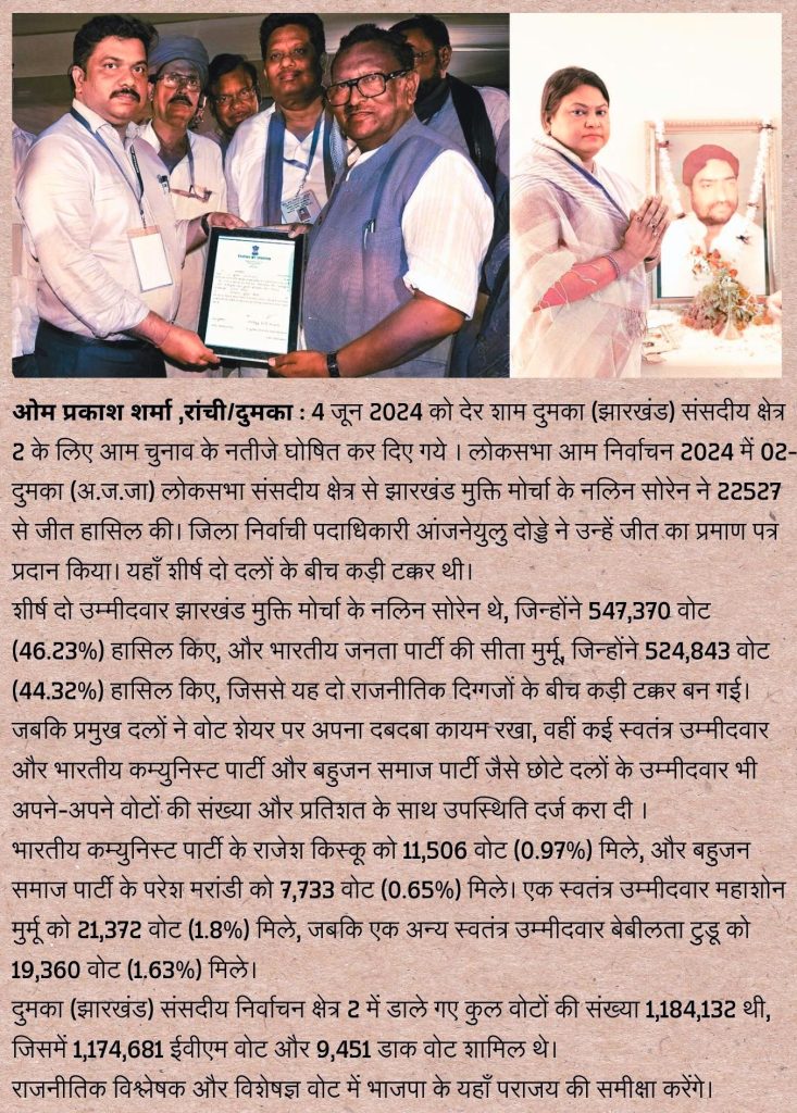 ओम प्रकाश शर्मा ,रांची/दुमका : 4 जून 2024 को देर शाम दुमका (झारखंड) संसदीय क्षेत्र 2 के लिए आम चुनाव के नतीजे घोषित कर दिए गये । लोकसभा आम निर्वाचन 2024 में 02-दुमका (अ.ज.जा) लोकसभा संसदीय क्षेत्र से झारखंड मुक्ति मोर्चा के नलिन सोरेन ने 22527 से जीत हासिल की। जिला निर्वाची पदाधिकारी आंजनेयुलु दोड्डे ने उन्हें जीत का प्रमाण पत्र प्रदान किया। यहाँ शीर्ष दो दलों के बीच कड़ी टक्कर थी।