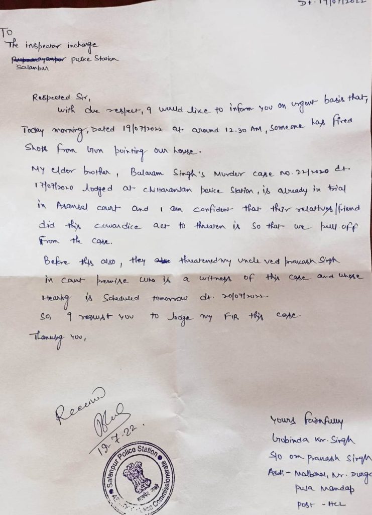 BHARATTV.NEWS: मिहिजाम / रूपनारायणपुर : सोमवार की देर रात बेखौफ अपराधियों ने सलानपुर थाना क्षेत्र के मालबहाल इलाके में बलराम सिंह के घर पर जा कर तबा तोड़ गोलियां चला फरार हो गए। इस मामले की शिकायत सलानपुर थाने में मृतक बलराम सिंह के भाई गोविंद सिंह ने की है। गोविंद ने अपने आवेदन में संदेह ज़ाहिर करते हुए कहा है की उसके भाई बलराम सिंह की हत्या चिरेका जीएसडी गेट पर 17 जुलाई 2020 को गोली मारकर कर दी थी। जिसमे चित्तरंजन थाने में कांड संख्या 22/ 20 दर्ज किया गया है। बलराम सिंह चिरेका कारखाने के स्क्रैप खरीददार थे।